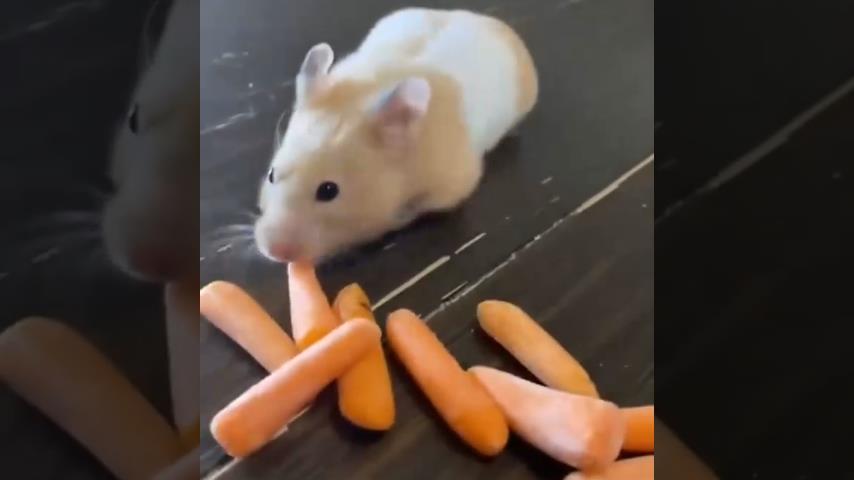 Kolik mrkve může křeček schovat ve svých tvářích; Lakomý křeček, snaží se do tváří uložit co nejvíce mrkve.