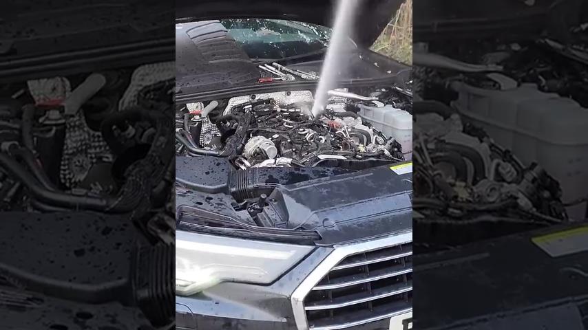 Mechanik demontuje zapalovací svíčky z motoru Audi A6, který byl naplněn vodou, a voda je rotací pístů vymrštěna do vzduchu.