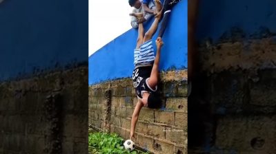 Jak ho jeho přátelé drží za nohy, mladý muž se pokouší chytit míč, který spadl do malého rybníka. Ale udělá špatný pohyb, aby hodil míč zpět…