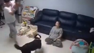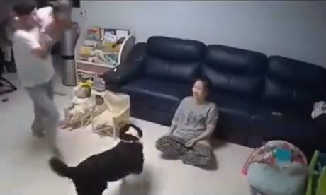 Otec hraje s celou rodinou „letadlo“., vyzvedávání malých dětí postupně, jeho pes a žena ve vzduchu, když běží přes místnost.