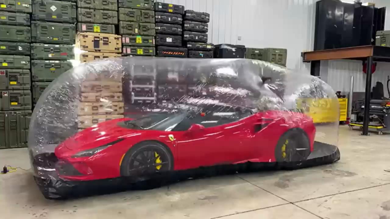 Testování vtipné kapoty auta, který nafoukne a ochrání vaše vozidlo před jakoukoli hrozbou.
