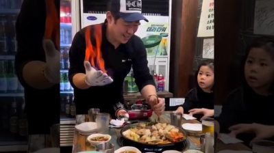 Servírování jídla se speciálními efekty v restauraci v Jižní Koreji.