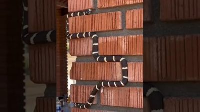 Ve výklencích mezi cihlami zdi se pohybuje had, připomínající hru 'had' ze starých mobilních telefonů.