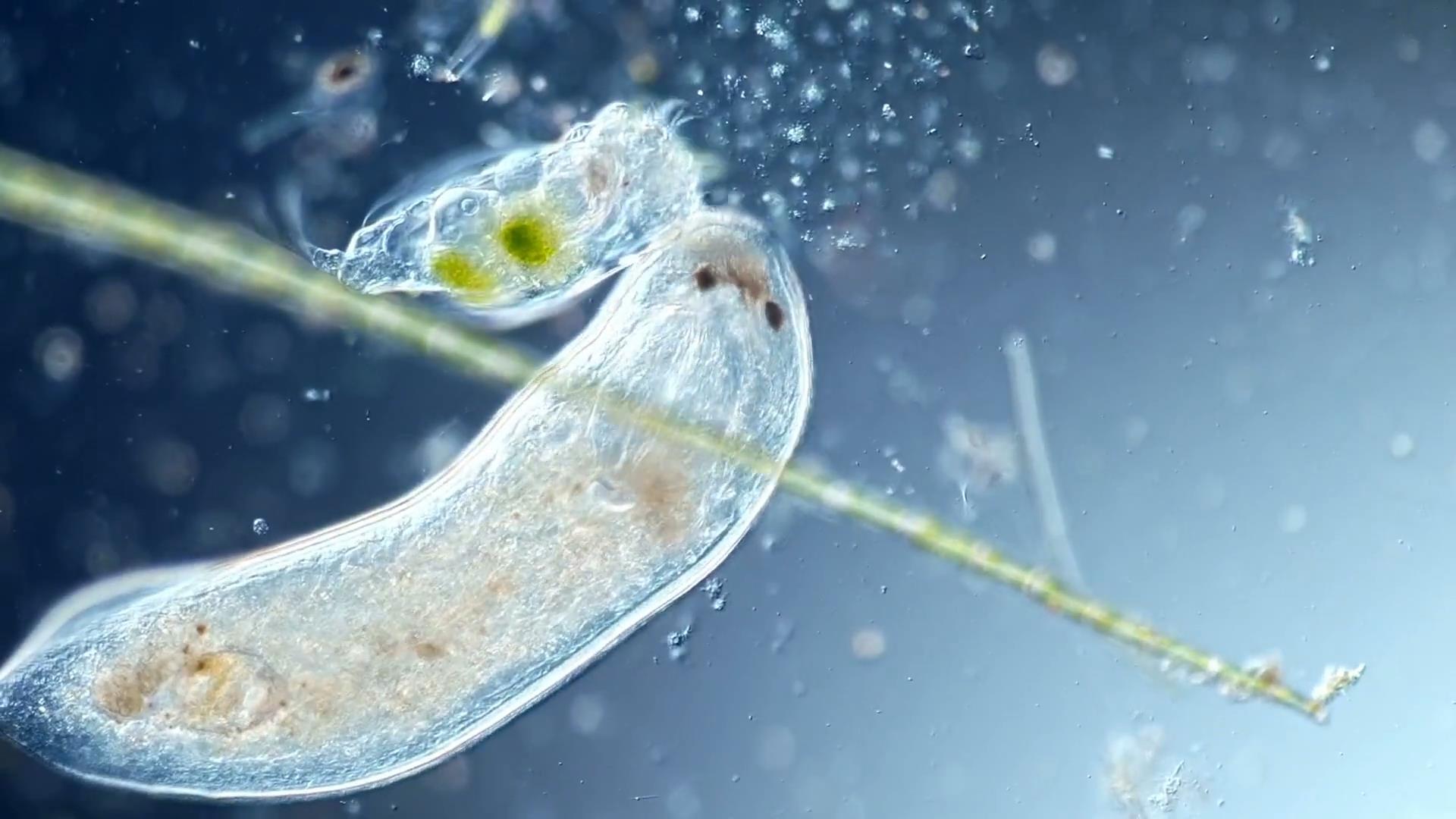 V malinkých rozměrech kolem půl milimetru (délka rámu), sledujeme platyhelminta (červovitý bezobratlý) vysát trakař z ulity.