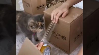 Kočka pomáhá svému majiteli při balení tím, že přestřihne balicí pásku svými zuby.