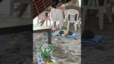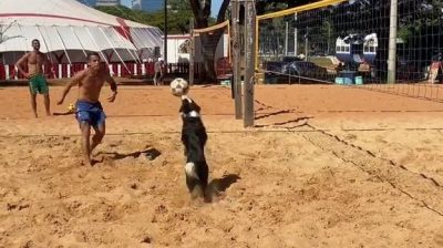 Na pláži v Brazílii, pes hraje plážový volejbal se svým majitelem. Pes dělá přihrávky skokem a úderem do míče nosem.