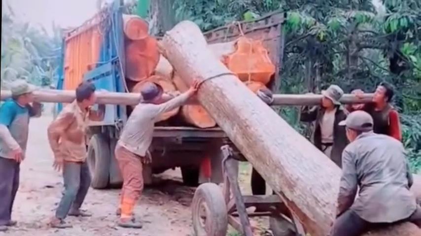 Dělníci nakládají velkou kládu na nákladní auto, bez použití zvedacích strojů.
