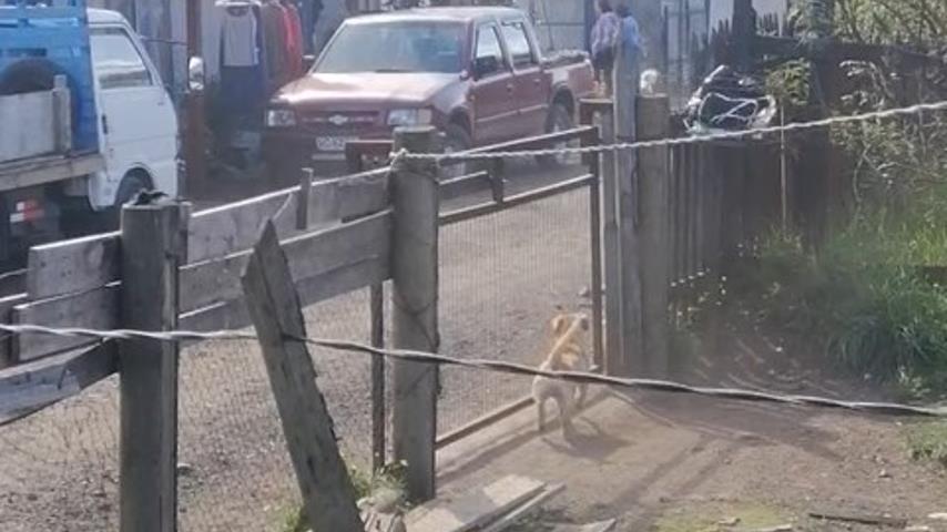 Ne tak statečný 'hlídací' pes v Coñaripe v Chile, hledá boj se sousedskými psy.