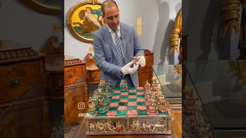 Šachovnice, jejíž výroba trvala deset let od neworleanského klenotníka Ruvena Perelmana. S pohyblivými částmi a figurkami, zobrazuje starověkou bitvu u Issu, kde Alexandr Veliký bojoval s králem Dariem.