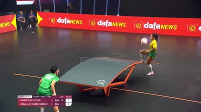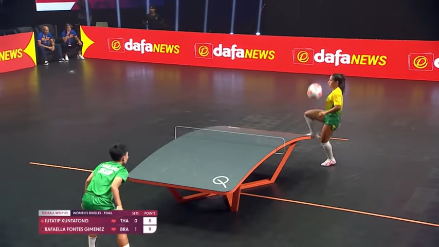 Zápas z Mistrovství světa v teqballu žen, sport, který se zrodil v posledních pěti letech a spojuje fotbal se stolním tenisem.