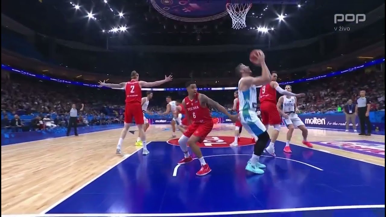 Goran Dragič chytře přivádí míč zpět přes polského hráče, znovu ji chytit a získat snadný bod. Snímek z EuroBasket 2022.