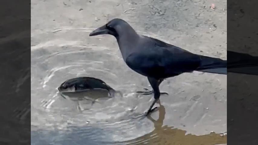 Volavka, vrána a čáp sledují rybu plující na mělčině. Chytil to zobákem, čáp ji odnese do hlubší vody a opustí ji. Možná ten čáp neměl takový hlad.