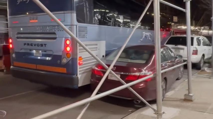 Řidič autobusu neopatrně přechází ulici v New Yorku, zdlouhavě škrábající bok zaparkovaného auta.
