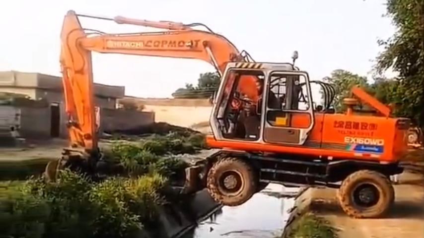 Zkušená obsluha rypadla přejíždí se svým strojem přes vodní kanál, působivým způsobem.