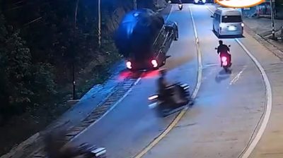 Řidič návěsu nezvládne svůj nadměrný náklad v prudkém kopci. Vozík se rozjede dozadu, udělat působivý backflip.