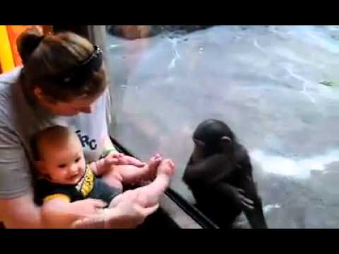 Dítě a malý šimpanz komunikovat v jejich vlastním způsobem v Zoo