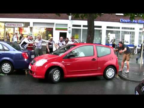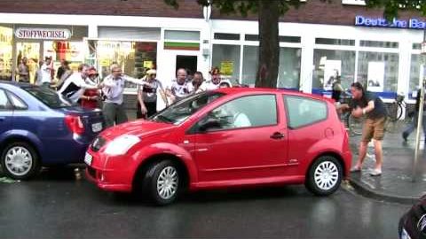 Žena je oživována fotbaloví fanoušci, stejně jako se snaží zaparkovat svůj vůz v Münsteru, Německo.