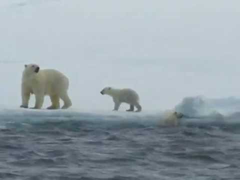 Lední medvěd pomáhá malé vyšplhat do ledovce, na východním pobřeží Grónska.