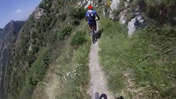 Cyklisté Andrea Balli a James McKnight Cyklistika na strmé stezce v regionu Alpes-Maritimes, Francie