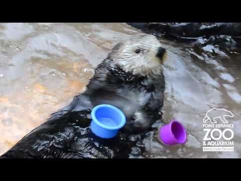 Nellie, roztomilý vydry v bodu vzdor Park Zoo ve Washingtonu, CAN a zásobníky s řadou malých plastových kelímků.