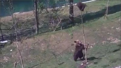 Medvěd, který se snaží se stáhli vyděšené málo ze stromu