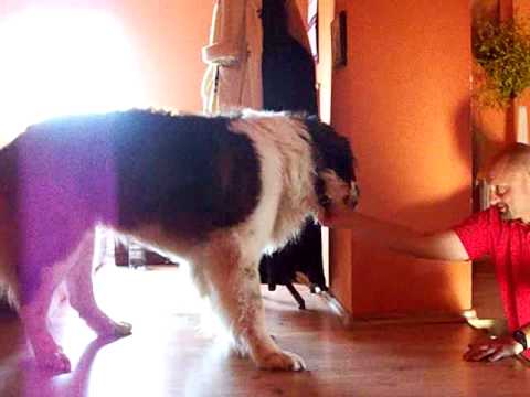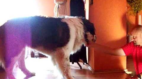 Tento pes St. Bernard má fobie sestoupit po schodech. To nemá problém jít nahoru, ale když musí jít z domu, je problém...
