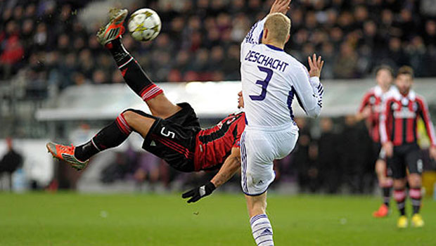 Hráč AC Milán Philippe Mexes dosahuje velmi krásný gól nůžkami proti Anderlecht v včerejší zápas ligy mistrů. Zápas skončil 3-1 ve prospěch Milán.