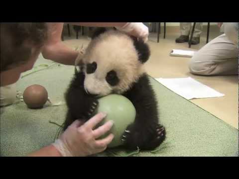 Zaměstnanci Zoo v San Diegu dávají míč 4měsíčníku, když ji zkoumají.