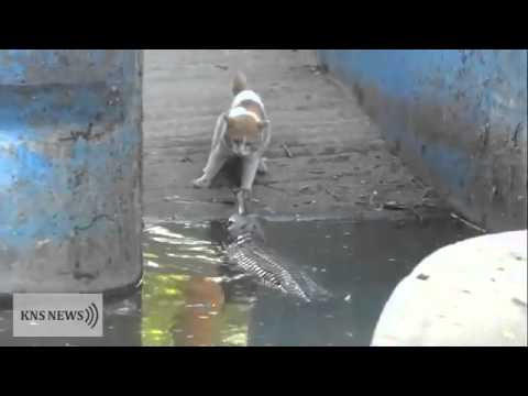 Tato statečná kočka šla nějak v prostoru jsou krokodýli, v Zoological Park Jaipur v Indii.