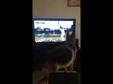 Německý ovčák útoky v televizi snaží chytit míč v videohry s baseball.