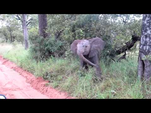 Malý slon dává své nejlepší já snaží hrát divoké a zastrašovací turistů.