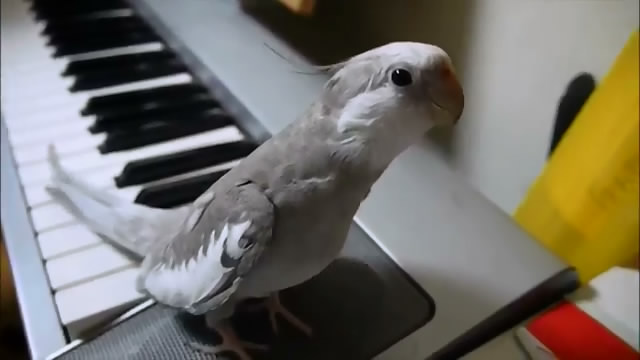 Úžasný papoušek zpívá téma z japonského animovaného filmu 'Můj soused Totoro' s jeho šéfem ho doprovázet na klavír.