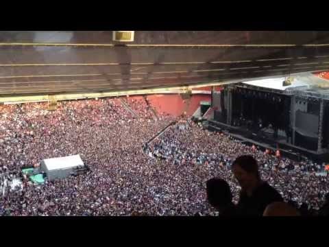 60 000 fanoušci zpívají slavné kus královna hraje na stadionu Emirates v Londýně reproduktory, před zahájením koncertu Green Day.