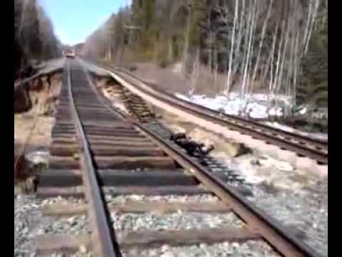 Torrent ničí půdu pod železniční tratě v Ontariu, Kanada