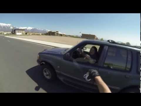 Motocyklista dodržuje hrnek na nárazníku auta a rozhodne se vrátit do svého majitele.
