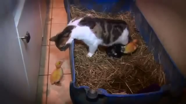 Kočka, která přijala tři vzpurné Kachňata, pokus s velkým úsilím dát je do režimu spánku.