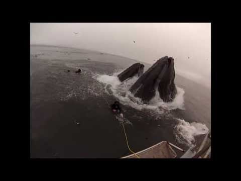 Dva megapteres velryby dorazit velmi blízko obou potápěče, jak se snaží krmit planktonem.