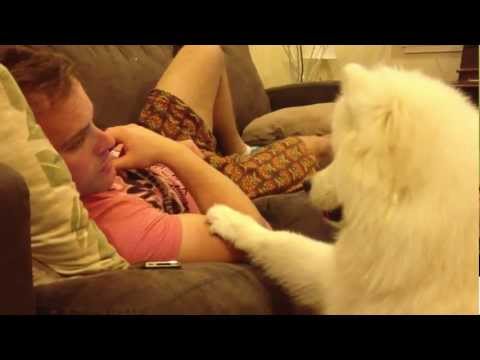 Rodokmen samojed štěně ptá laskání od svého šéfa.