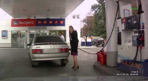 Žena, která se snaží umístit benzín do auta, Převede na jednoduchý proces na televizi.