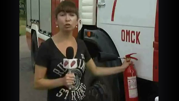 Reportér se snaží udělat ukázku použití hasicí přístroj, ale selže bídně.