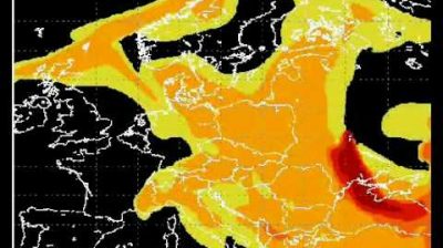 To je cloud šíření radioaktivity z černobylské jaderné havárie v Evropě. Větší intenzitě a nebezpečí radioaktivity je zvýrazněn červeně.