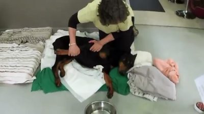 Kenny, ochrnutý dobrmani s vážným poškozením páteře, učí chodit po úsilí lidí v organizaci Dvě ruce čtyři tlapky.