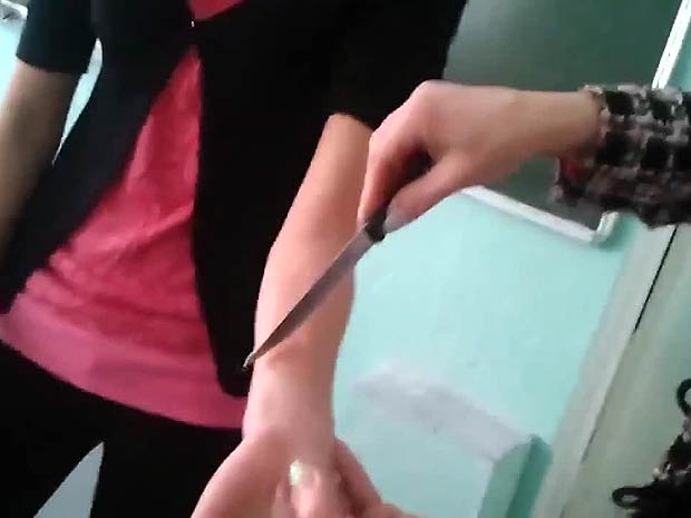 V kurzu chemie v Rusku, Učitel ukazuje své studenty zajímavé chemické reakce, Když dva průhledné kapaliny přicházejí do styku. První kapalina se umístí do ruky student, a druhý na okraji nůž. Když přijdou do kontaktu, Vytvoření temně červené barvy, Vypadá to jako krev v rukou studenta. K dosažení této reakce, Profesor zaměnit ethanolu s jodem.