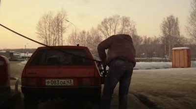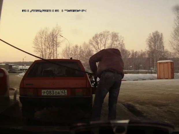 Na čerpací stanici v Rusku, Muž se snaží dát benzin, ostatní se trochu zaparkoval od čerpadla a obtížnosti. Tak bude řešit problém s ruským způsobem.