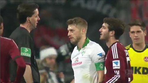 V chvályhodné demonstrace fair play, Werder Bremen hráč Aaron Hunt odmítá přijmout trest, který vydal rozhodčí ve prospěch léčby, říká, že nic se mu nestalo.