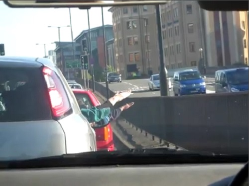 Dva řidiči v Británii hrají rock papír nůžky s rukama z oken, čekání na odpojení od dopravní zácpy.