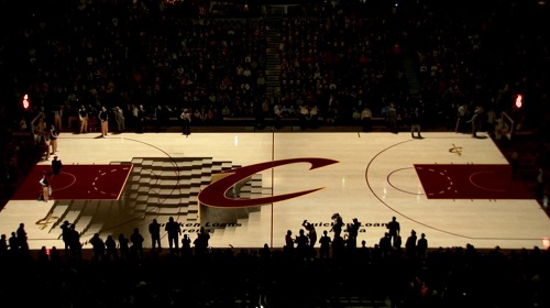 Před začátkem závodu, Některé projektory vytváří ohromující podívanou na stadionu Cleveland Cavaliers.