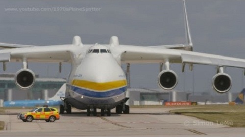 Antonov 225, největší a nejtěžší letadlo vůbec postavena, kdy, startuje z letiště v Manchesteru. Antonov může vzlétnout s celkovou hmotností 640 tun a má šest motorů.