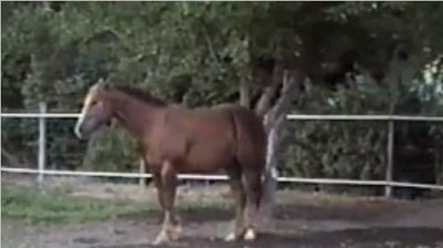 Tento kůň chce jíst jablka, a on ví trik hodit ze stromu jablko.