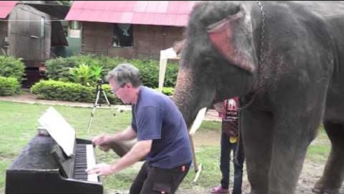 Pianista hraje piano blues a slon se rozhodne doprovázet ho. Videa z slon svatyně v Thajsku Elephantstay.